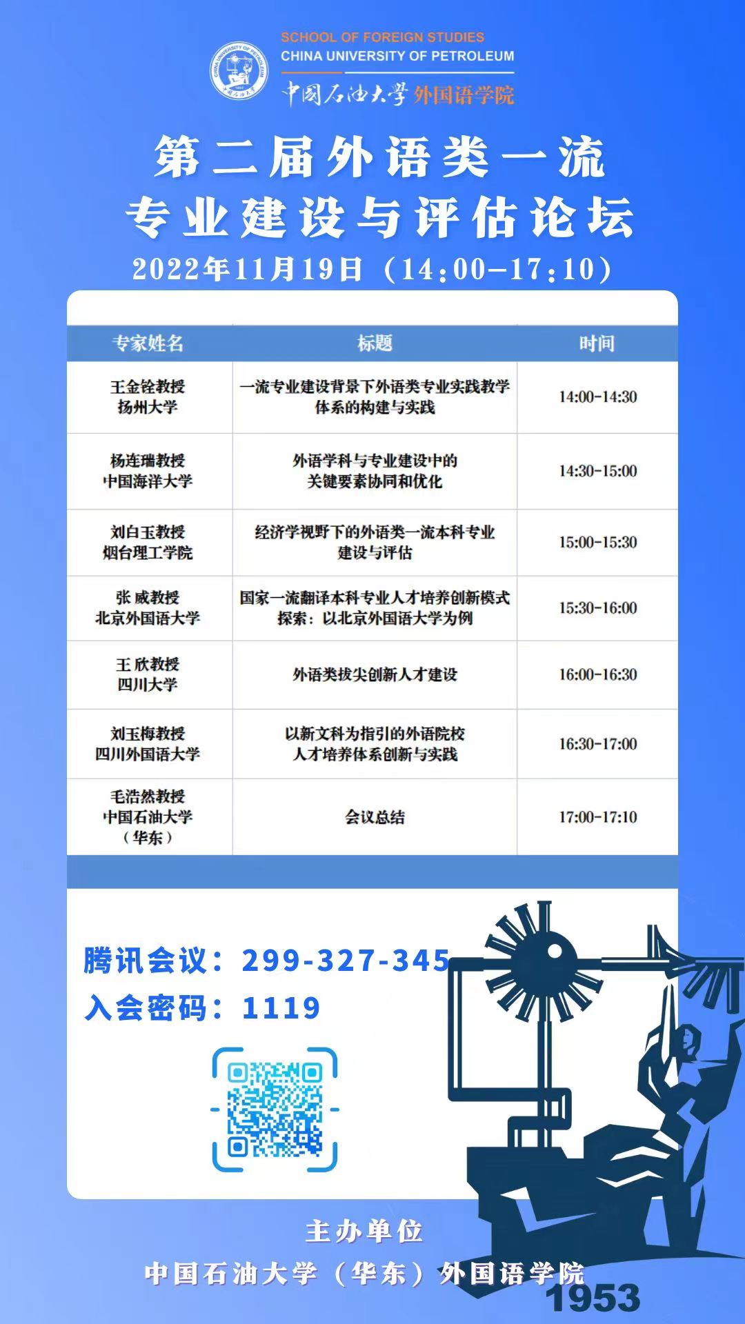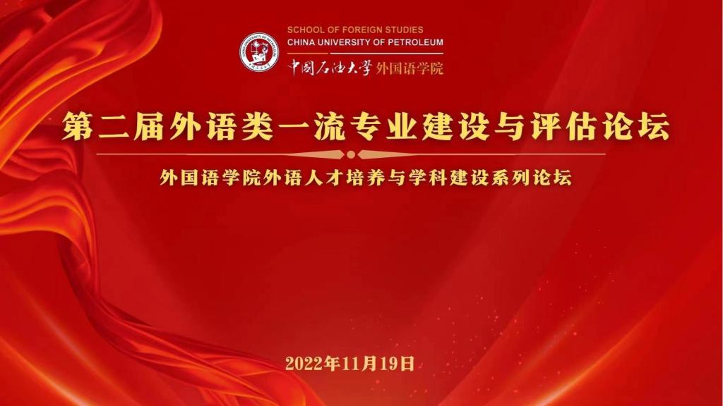 为进一步推动外语类国家级一流本科专业建设工作,全面提升本科人才培养质量,由中国石油大学(华东)外国语学院主办的“第二届外语类一流专业建设与评估论坛”于 2022 年11 月 19 日下午在线上召开,全国近300名英语类专业专家、教师、博士生、研究生代表参加。