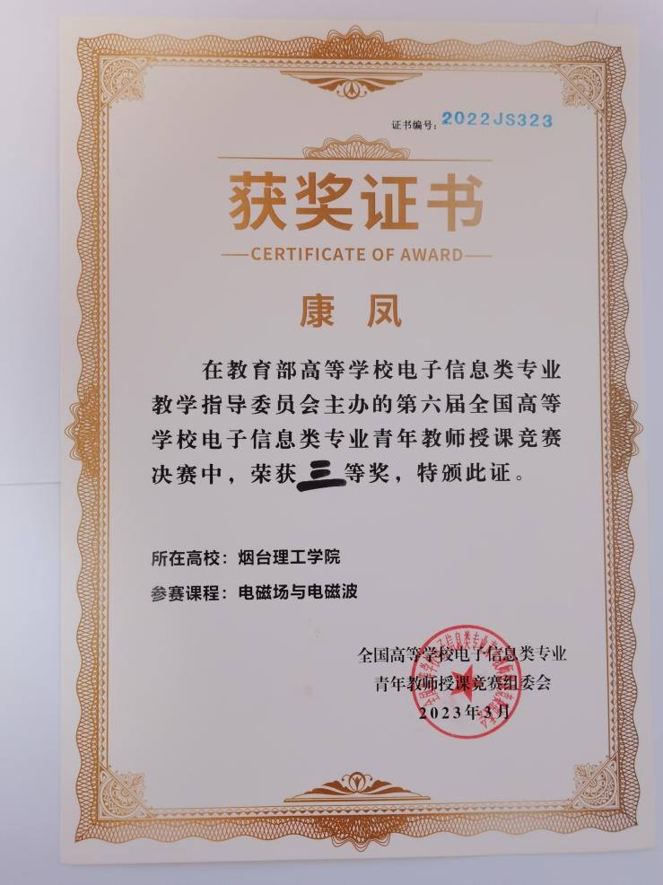 第六届全国高等学校电子信息类专业青年教师授课竞赛分为预赛和决赛两个阶段。大赛于2022年4月启动,吸引来自全国众多“双一流”高校(清华大学、浙江大学、哈尔滨工业大学、武汉大学等众多知名高校)在内的200余所高校的500余位青年教师参加。通过评审,最终全国共有182名选手从四大赛区脱颖而出,进入决赛。决赛根据课程分为6组进行,每组20人左右。参赛教师通过抽签确定比赛顺序和授课内容,并进行了20分钟现场教学展示。康凤老师讲授的《电磁场与电磁波》获得全国三等奖,充分展示了先进的教学理念以及教学改革与创新成果,展示了烟台理工学院青年教师的风采。