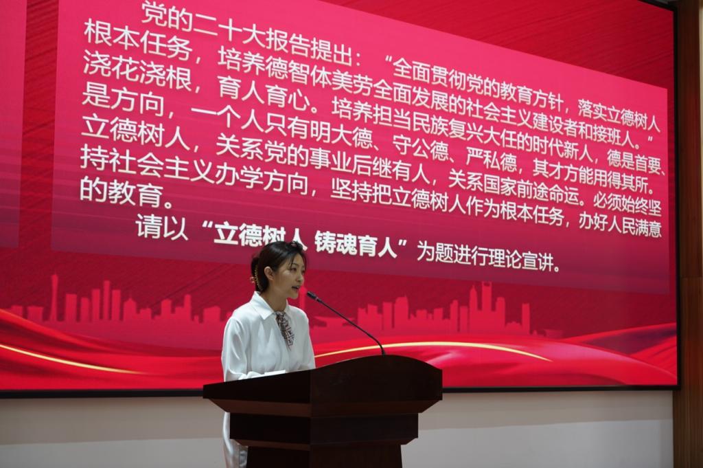 决赛中的理论宣讲主要考察辅导员对党的二十大精神、习近平新时代中国特色社会主义思想等内容的学习宣传阐释能力,帮助大学生处理好学习成才、择业交友、健康生活等方面具体问题,赛场上,参赛选手们紧扣新时代新征程,以引领学生思想为主线,回眸历史、聚焦当下、放眼未来,全面地阐述了自己的观点,充分展现了我校辅导员扎实的理论功底、深厚的政治素养和昂扬的精神风貌。