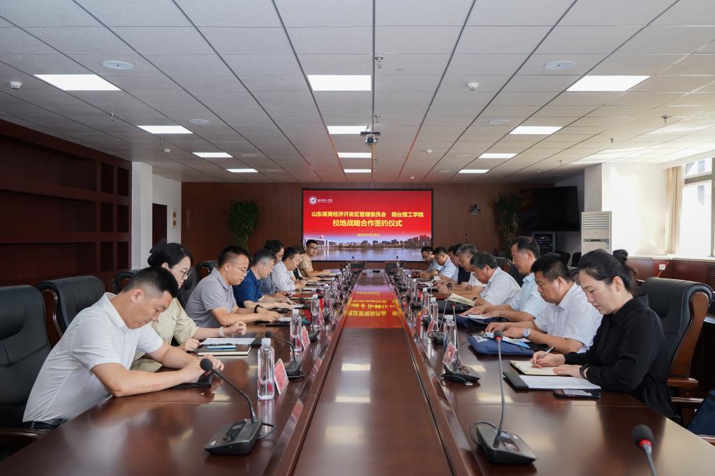 8月29日下午,山东高青经济开发区管理委员会与烟台理工学院战略合作签约仪式在学校综合楼六楼视频会议室举行。高青县委常委、副县长,高青经济开发区党工委书记孙耀祖,高青经济开发区党工委副书记、管委会主任赵学民一行来我校考察交流,校长于光辉,党委书记盛国军,副校长苏春景,校长助理、招生就业处处长李洁及相关二级学院和职能部门负责人与会。