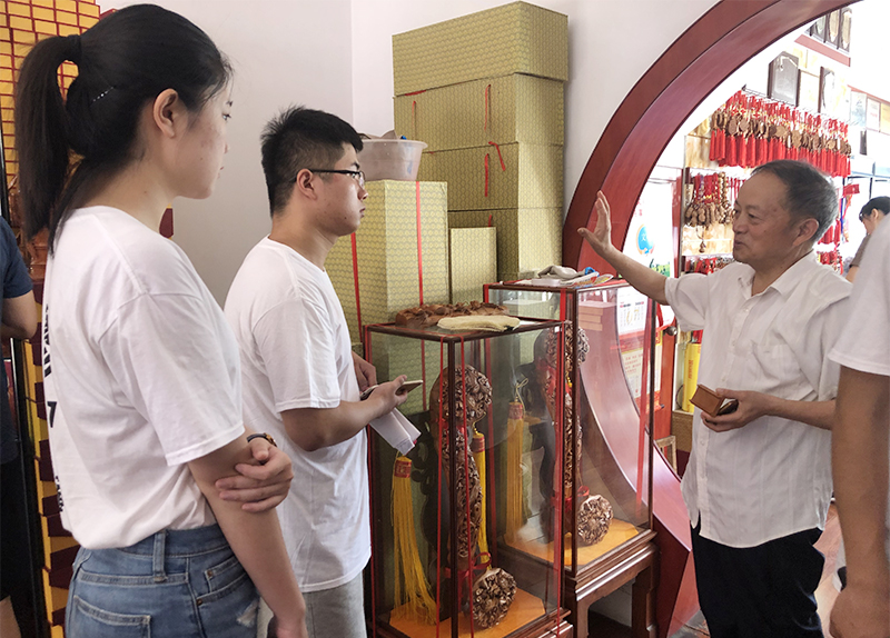 实践期间,队员们通过追根溯源了解桃文化历史,深入肥城市桃园镇采访桃农,得知肥桃在长期的栽培过程中,形成了许多不同的品系类型。随后,队员们参观肥城市中国桃木文化博物馆,走访以“程木匠”为代表的多家桃木工艺品商店,调研桃木产业发展现状,掌握桃木工艺品市场背景,了解不同物件的具体内涵。在肥城市正港木业工艺品厂,队员们拜访桃木雕刻师,领悟工匠精神,学习桃木工艺品制作工序,亲身感受桃木文化的魅力。