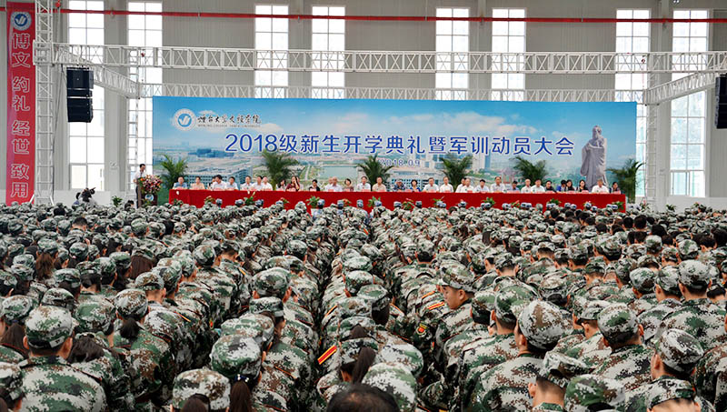 9月3日上午,2018级新生开学典礼暨军训动员大会在大学生文体中心举行。中国人民解放军海军某部队上尉周新刚,烟台大学文经学院董事会执行董事曹世民,院领导于光辉、唐家弘、王来武、刘孔庆、李荣梅、辛连军、尤敬法、莫红菊、杜希成、史毅出席大会。各系部党政负责人、相关职能部门负责人以及近4000名新生参加大会。大会由副院长王来武主持。