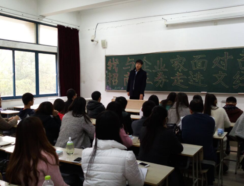 11月16日,经济系举办“我与企业家面对面”活动,邀请到招商证券烟台分公司李升明经理与经济系师生座谈。李升明经理分析了目前证券投资行业的发展现状及未来趋势,并介绍了招商证券人才需求状况。他认为,大学生职业目标的实现,离不开主观能动、沟通表达、组织实施、逻辑思维、关心时事以及对自我认知等能力的培养。活动过程中,大家积极交流,相互讨论,学生对投资学专业方向、目标规划有了更深的认识与思考。