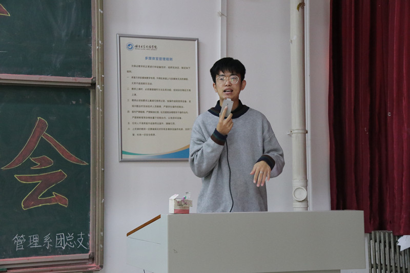 管理系团总支科技实践部部长魏绍卉就赛事相关内容及注意事项进行详细解读,要求各参赛成员熟练掌握比赛规则,优化课题选择。随后,往届优秀队伍负责人进行经验分享,“萌蘖”队在创业计划书的撰写、高效团队的组建及项目特色等方面给予专业性指导;“铸就七彩梦想”队针对参赛队员提出三点建议:一是要稳定心态,切勿半途而废;二是要突破课题局限,勇于创新;三是在组队方面要优化人员配置,打造适合自身发展的道路。两支队伍精彩的发言极大地启发了在座同学,赢得了同学们热烈的掌声。最后,柳嘉靖老师强调道,此次比赛不仅能够提高同学们的实践能力,更能磨炼意志、开拓眼界,希望各位同学积极参加,通过实践将所学的专业知识得到巩固和提高,在实践中收获与成长。
