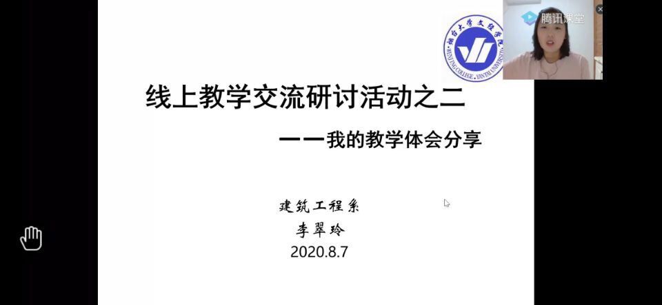 暑假期间,建筑工程系教工党支部组织全系教师使用腾讯课堂以“屏幕分享+语音+视频”的形式进行了三次线上课程经验分享交流,此次交流会是“疫情下在线课程建设”活动之一,是基于一学期线上教学工作的总结,为全系教师提供经验交流的平台。三次交流会分别有(杨杰、刘莹、李翠玲、赵彥娟、刘彬、王虹霖、潘萌、张檬元、杨纪婷、邹金益、王伟萍等)11位教师对过去一学期在线课程的建设方法与心得进行了分享。
