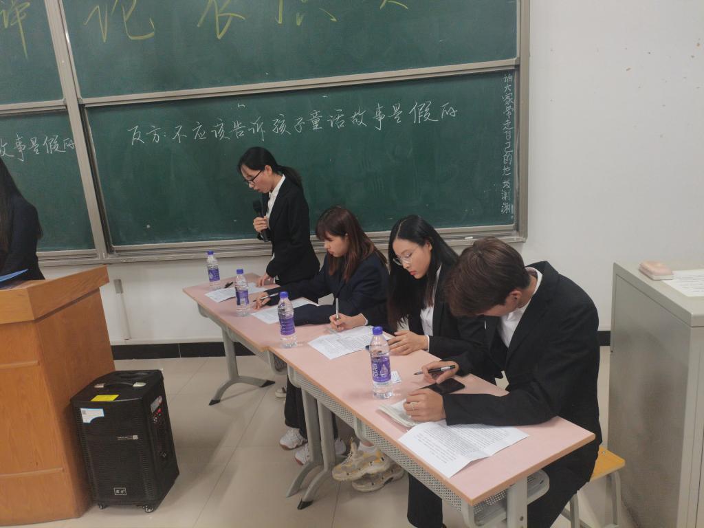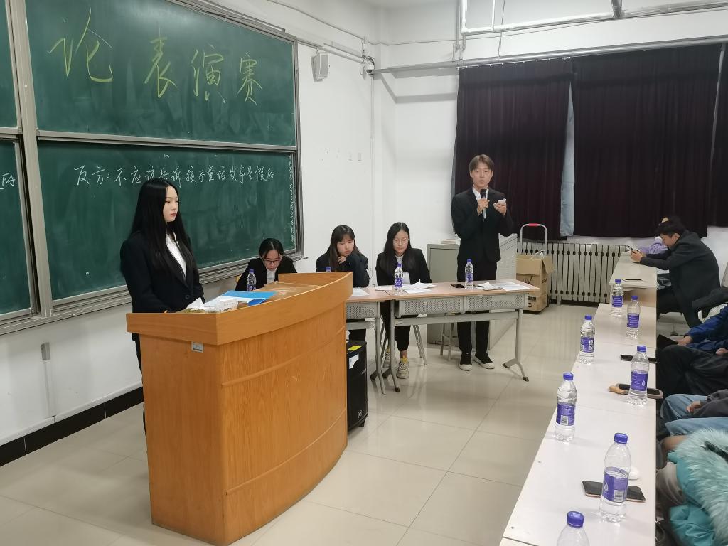 首先,双方一辩陈述,为本场辩论破题理论,继而正反双方二三辩选手展开攻辩环节,正方辩手从童话对孩子的影响讲至自己的亲身经历,循序渐进,不乏幽默,风趣地陈述了己方“应该告诉孩子童话是假的”观点。反方辩手根据对方论据漏洞给予反驳,字字掷地有声,同时又以探索的角度为切入点,用严谨的逻辑推理,侃侃而谈。双方幽默生动的语言,唇枪舌剑的争锋博得场下阵阵掌声。自由辩环节,反方辩手旁征博引,巧妙攻辩,正方辩手也不甘示弱,言语激昂。最后,双方四辩总结陈词,用概括性的语言为比赛争取最后的胜利。辩论赛结束后,食品系辩论队的学长学姐们又进一步介绍了在实战中辩手对于赛场的准备以及新生辩论赛的具体流程和注意事项。