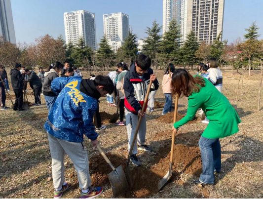 活动伊始,在王晓黎书记的号召下学子们各个跃跃欲试,拿着铁锹和镐子给树苗挖树坑。活动现场,老师们手把手地指导同学们植树,提示大家要注意安全并告诉同学们种树的技巧。在此次活动中,虽然不少人是第一次参加植树活动,但在劳动中大家相互帮助、交流经验,很快他们就找到了自己的节奏。老师们和同学们一起协作,大家相互配合,挥锹铲土、扶树填土、培土浇水,一气呵成,活动现场热火朝天!通过大家的共同努力,在欢声笑语中,植树活动最终圆满结束。