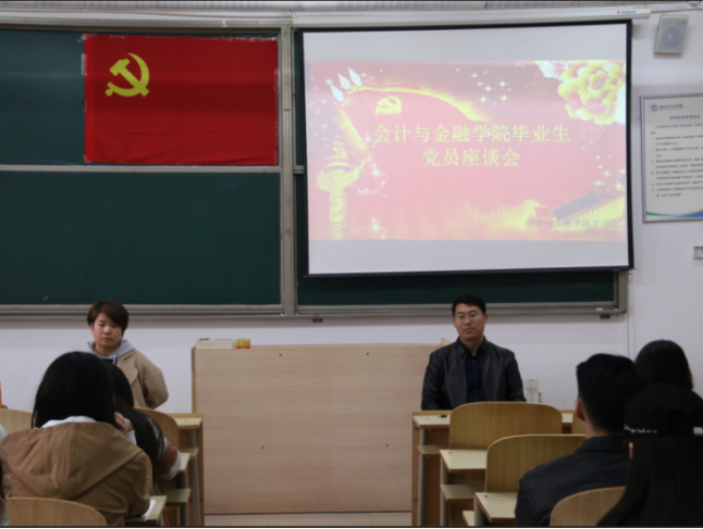 为进一步了解毕业生思想动态,帮助毕业生顺利毕业、尽早就业,4月26日下午,会计与金融学院在一教310召开2021届毕业生党员座谈会。学院党总支书记曹钊庆、团总支副书记孙小慧、辅导员纪靖欣、郑家申出席,全体毕业生党员参加,座谈会由辅导员韩旭艳主持。
