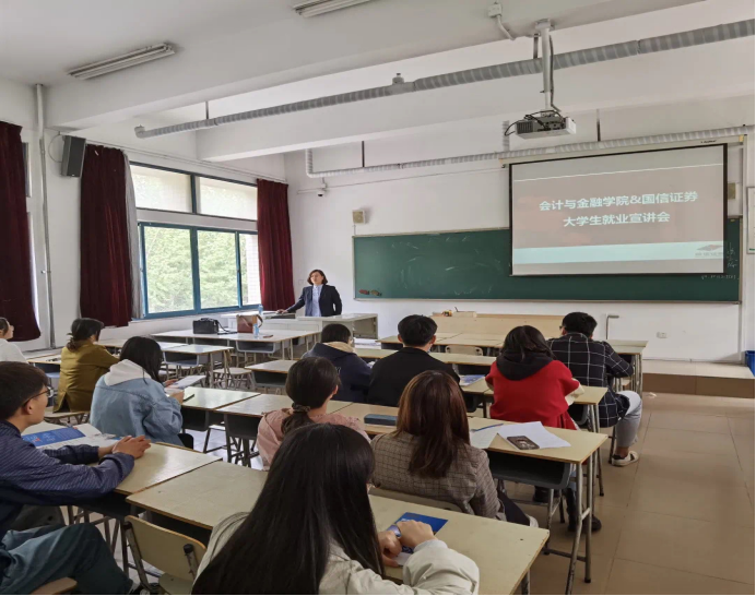为鼓励应届毕业生积极就业,拓展毕业生就业渠道,2021年4月29日下午,会计与金融学院在一教312举办国信证券专场招聘会。招聘会由就业工作辅导员韩旭艳老师主持,国信证券股份有限公司二部总经理王丽荣、客户经理张红倩进行了宣讲,2021届毕业生参加了此次招聘会。