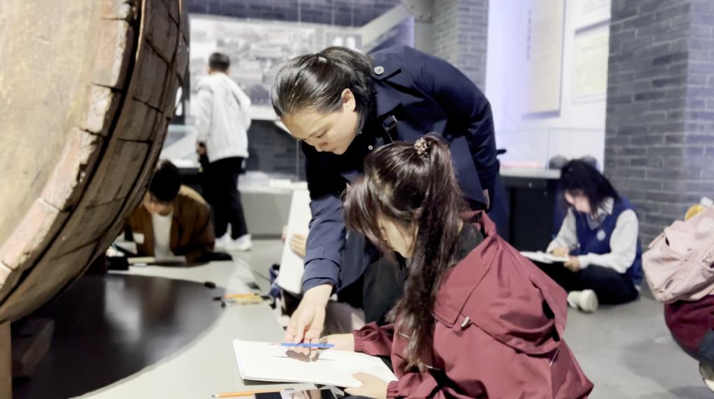 为了构建富有专业及思政元素的优质教学资源,探索胶东传统文化与红色文化融入课程思政的新范式,创新艺术类专业情景式育人模式,10月14日,烟台理工学院建筑工程学院数字媒体艺术专业教研室主任潘萌与设计素描课程教师团队带领23级的学生们来到烟台博物馆开展情景式创作课堂实践。本次教学活动在省级教学改革课题《课程思政视域下艺术设计专业“三三三”情景式教学模式研究与实践》支持下,并邀请到建筑工程学院教师党支部书记、教学督导王伟萍老师参加。