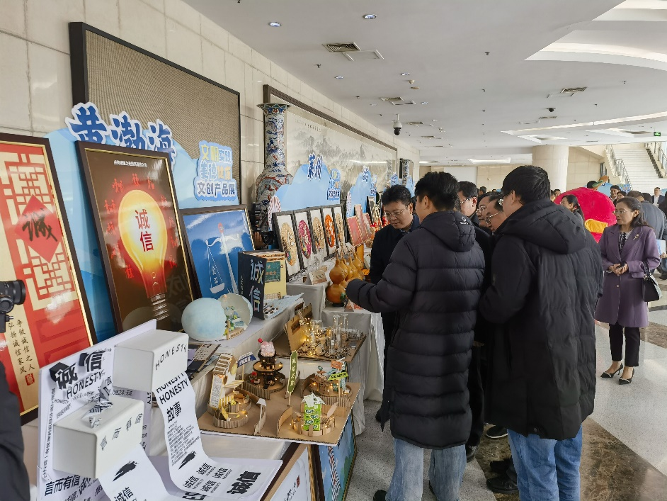 “文明实践 美德健康”文创作品展聚集了烟台各个市区的优秀文化作品。数字媒体艺术专业践行应用型专业建设,培养学生的创新能力,在2023年6月学生装置设计作品在黄渤海新区举办的“圣文杯”美德信用公益大赛中多件作品获奖,在获奖作品中有六件作品入选本次展览,获奖学生之一任诗通作为黄渤海新区展区讲解员参加展览。入选展览的作品是以“美德诚信”为主题,学生们利用日常生活废弃物和一些环保材料进行文创产品设计与制作。